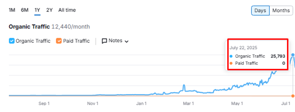 Monthly organic traffic surged to 25,793 visits, reflecting the effectiveness of content, technical, and local SEO improvements. Engagement metrics also improved dramatically: