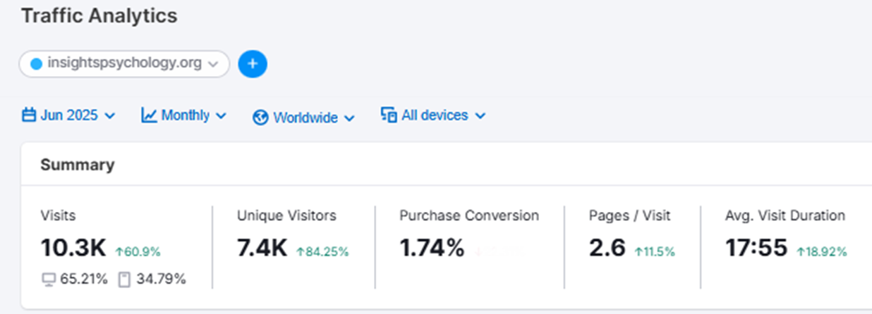 The implementation of ThatWare’s Hyper-Intelligence SEO framework brought transformative results for Insights Psychology, showcasing how AI-driven optimization can drive measurable growth in competitive sectors like mental health. Within a year of executing the strategy, the clinic experienced significant improvements across every key metric, from backlinks and domain authority to organic traffic and user engagement.