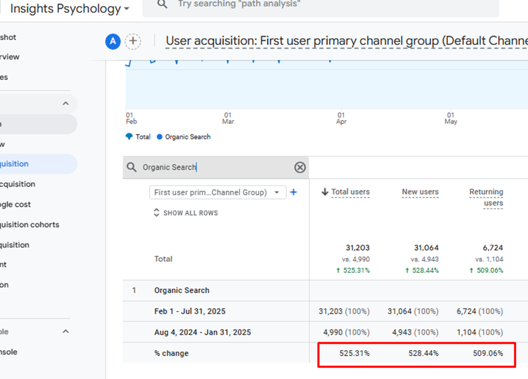 Insights Psychology’s performance in Google Search Console reflected significant growth: total clicks rose sharply, impressions multiplied, and the average search position improved substantially. Even as impressions grew and the click-through rate adjusted naturally, the overall visibility of the clinic skyrocketed. GA4 metrics showed total users from organic search increasing by 525.31%, sessions up 459.39%, and engaged sessions up 365.28%, further emphasizing the campaign’s impact on user acquisition and retention.
