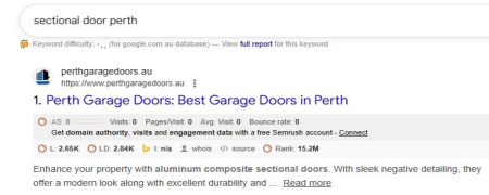 The keyword ‘sectional door Perth’ reached position #1, which means Perth Garage Doors appeared as the very first result when users searched for that service.