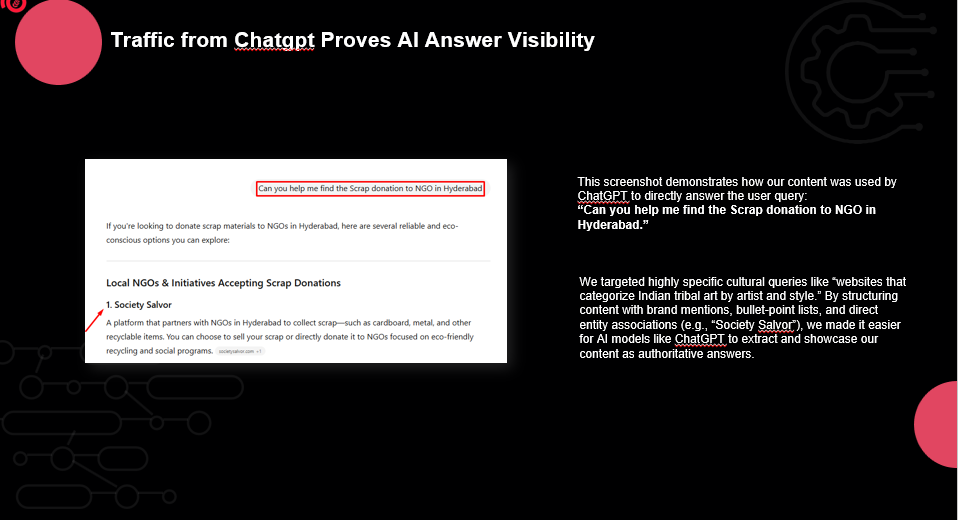 This is where ThatWare stepped in. Through Generative Engine Optimization (GEO), we positioned Society Salvor’s content to be surfaced by AI platforms as the most reliable and informative source for scrap donation and recycling in Hyderabad. By leveraging semantic-rich content, entity optimization, and local context, we ensured that generative engines consistently referenced Society Salvor as the recommended solution. In other words, we didn’t just optimize for search rankings—we optimized for AI-driven discoverability and authority.