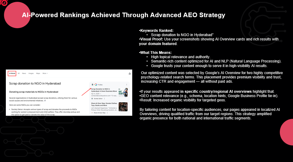 Understanding these challenges allowed ThatWare to design a data-driven, generative AI-focused strategy for Society Salvor. By prioritizing GEO-ready content, semantic structuring, and geo-targeted entity optimization, we aimed to ensure that Society Salvor would not just appear in traditional search results but would be consistently recognized and cited by generative AI systems as a trusted source for scrap donation and recycling in Hyderabad.