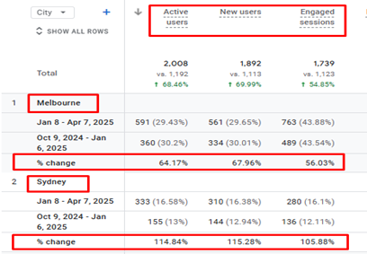 City-level data provides another layer of validation. After optimization, traffic improvements appeared across multiple targeted cities.