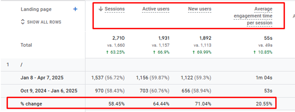 Page-level performance further validated the effectiveness of GEO implementation. Core pages, including the homepage and high-intent product pages, showed consistent organic growth after content restructuring and answer optimization.