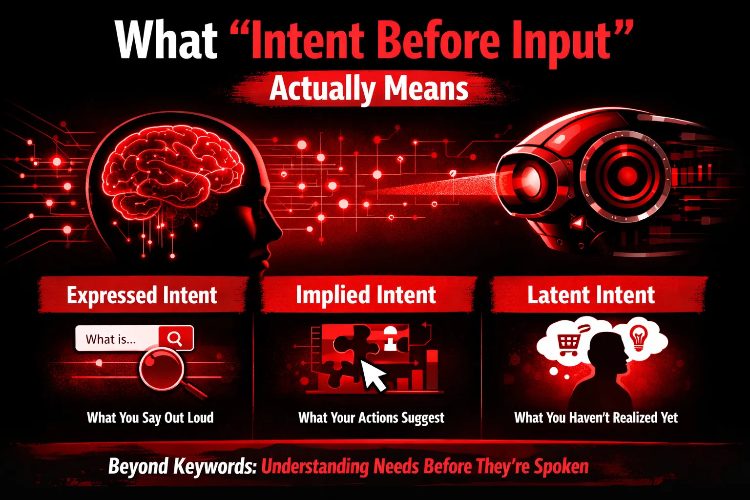When we talk about “intent before input,” we’re describing a fundamental shift in how AI-driven systems understand users. Instead of waiting for people to clearly state what they want, AI now works backwards—observing signals, context, and patterns to predict intent before it’s consciously expressed. This is where visibility is increasingly decided.