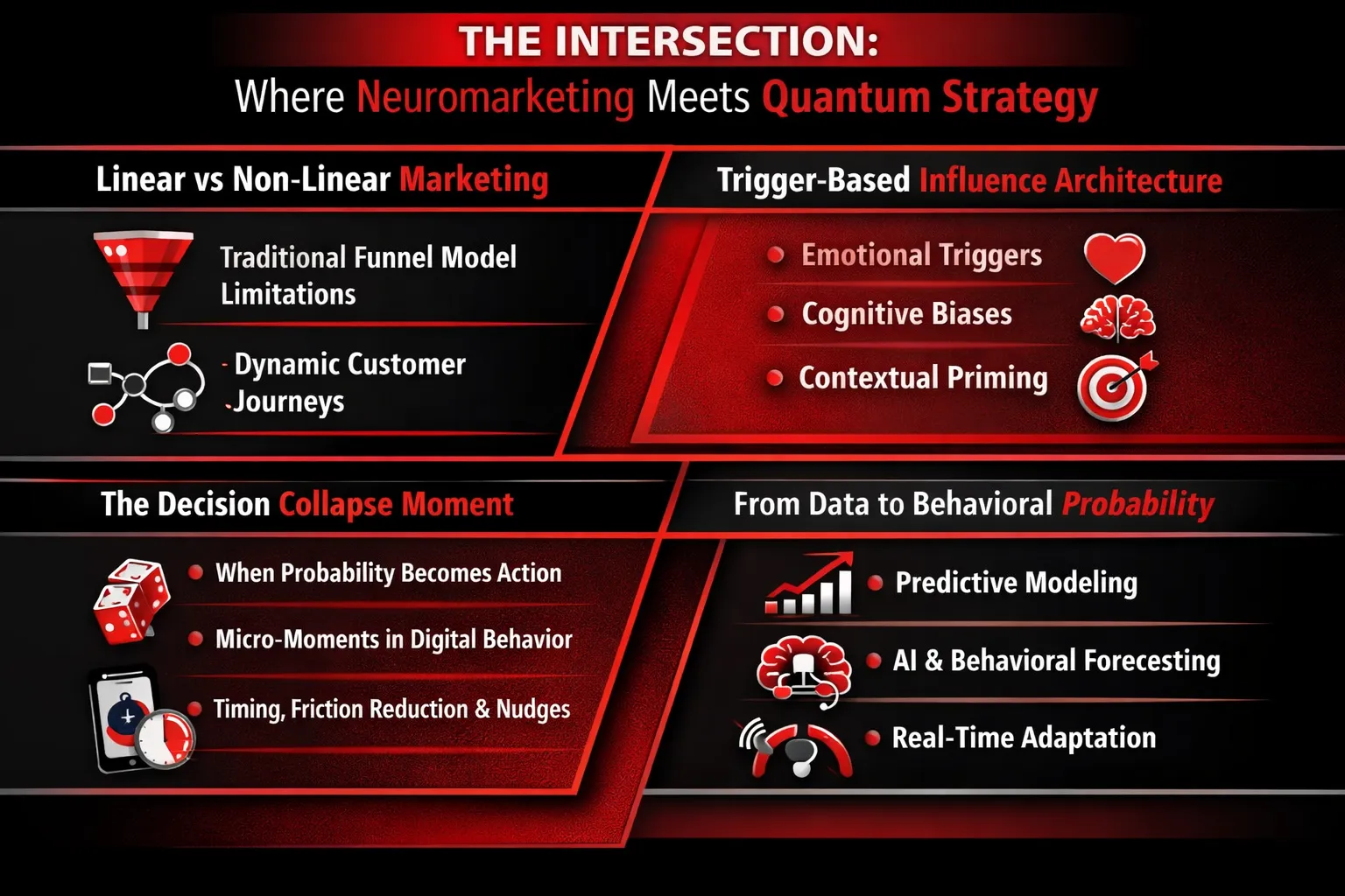 In neuromarketing and quantum strategy, success lies in understanding probabilities — then designing environments that increase the likelihood of action. Influence is no longer about persuasion alone; it’s about engineering emotionally aligned, frictionless, context-driven decision moments.