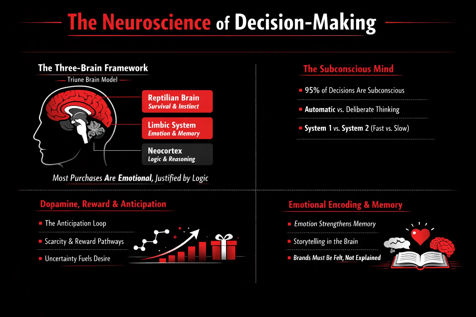 To decode consumer behavior, it helps to look at decision-making the way the brain actually executes it: through layered systems that evolved for survival, social belonging, and reasoning. When you understand these layers—what triggers them, how they interact, and how memory locks in preferences—you start to see why people buy what they buy, and how brands can influence choices ethically and effectively.