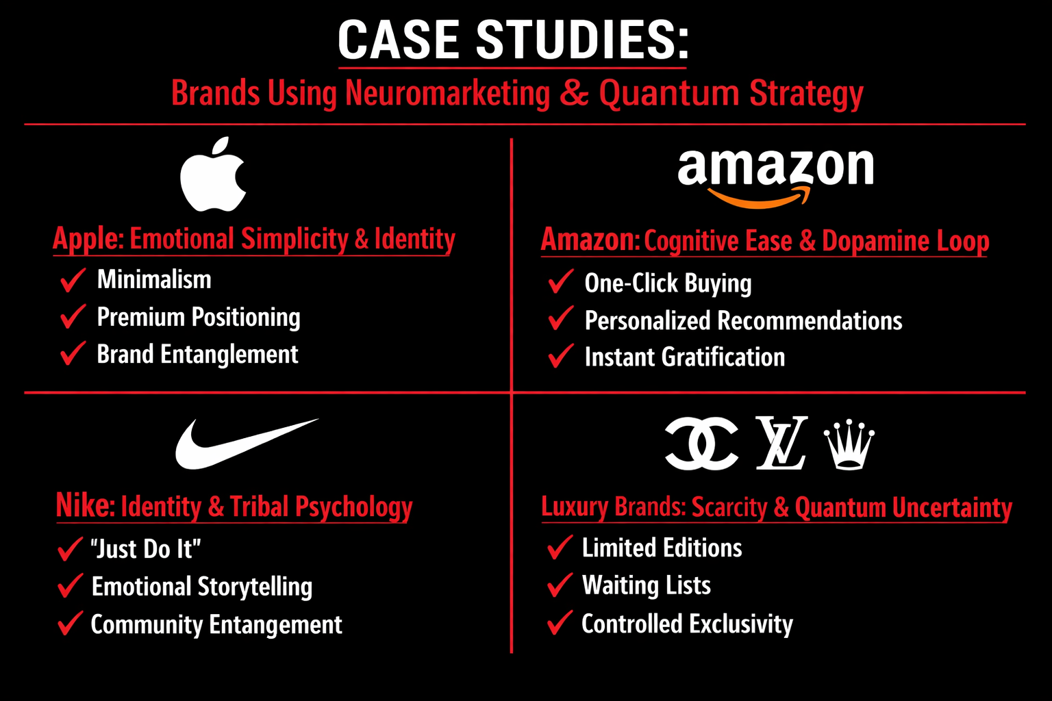 The true power of neuromarketing and quantum strategy becomes visible when we examine the world’s most dominant brands. These companies do not merely sell products — they engineer decision environments. By aligning neuroscience with probabilistic consumer behavior, they shape desire, collapse indecision, and create powerful brand entanglement.