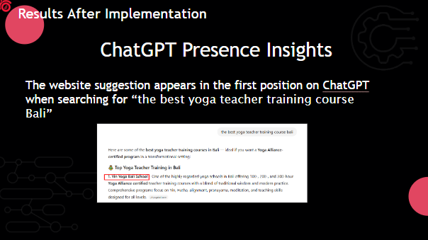 Despite its proven expertise, Yin Yoga Bali faced a gap: its content and online presence were not structured in a way that AI search systems could easily understand, interpret, or recommend. While human users could navigate the website and find information, intelligent discovery platforms — like AI recommendation engines and conversational assistants — struggled to extract actionable insights or contextualize the school within the competitive landscape of global yoga training.