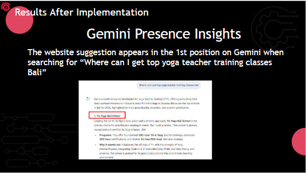 Perhaps most critically, Google AI Overview, which aggregates high-intent search results and recommendation panels, began including Yin Yoga Bali for relevant program searches. This not only increased visibility to potential students at critical decision points but also reinforced credibility and authority across the wider AI ecosystem. By encoding trust signals, testimonials, and structured course data, we ensured that Google’s AI could interpret Yin Yoga Bali as a reliable and authoritative entity.