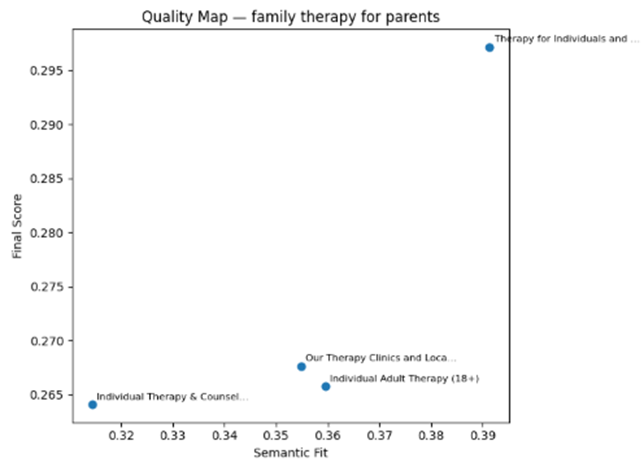 - Quality Maps – Plotted semantic fit vs. PageRank score, revealing a clear positive correlation.
