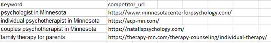 - Collected Input Data – A list of target pages with corresponding keywords and competitor URLs.