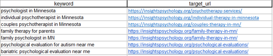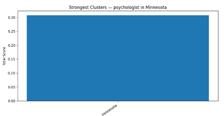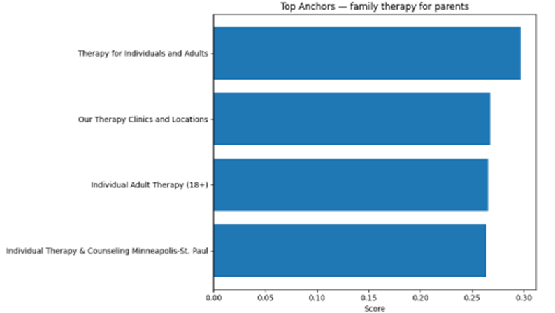 - Semantic Cluster Graphs – Showed how related anchors grouped naturally around keyword themes like “mental health,” “therapy,” or “online counseling.”