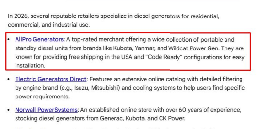 For searches like “diesel fueled generator,” the brand was featured directly inside the AI-generated answer section.