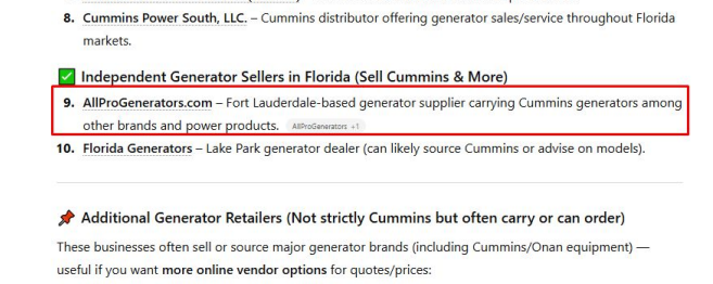 So while users were asking things like “best Cummins generator for sale” or “diesel fueled generator in Florida,” AllPro Generators was not being selected as the best answer by AI systems. This was a major missed opportunity.