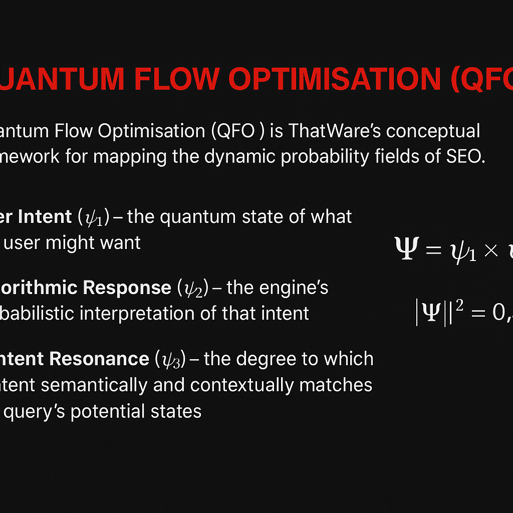 Quantum Flow Optimisation (QFO) is ThatWare’s conceptual framework for mapping the dynamic probability fields of SEO — where every ranking signal, click, and query forms part of a quantum field of possible outcomes. Instead of computing static rankings, QFO models “flows” — ever-changing interactions between: