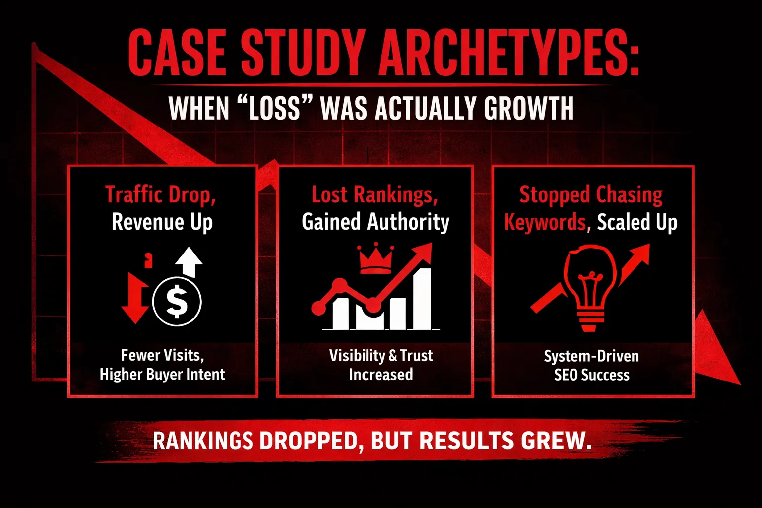 Not every downward graph is a failure. In modern SEO, some of the most meaningful growth stories begin with what looks like a loss. Below are three recurring archetypes where “ranking drops” turned out to be strategic wins once the right lens was applied.