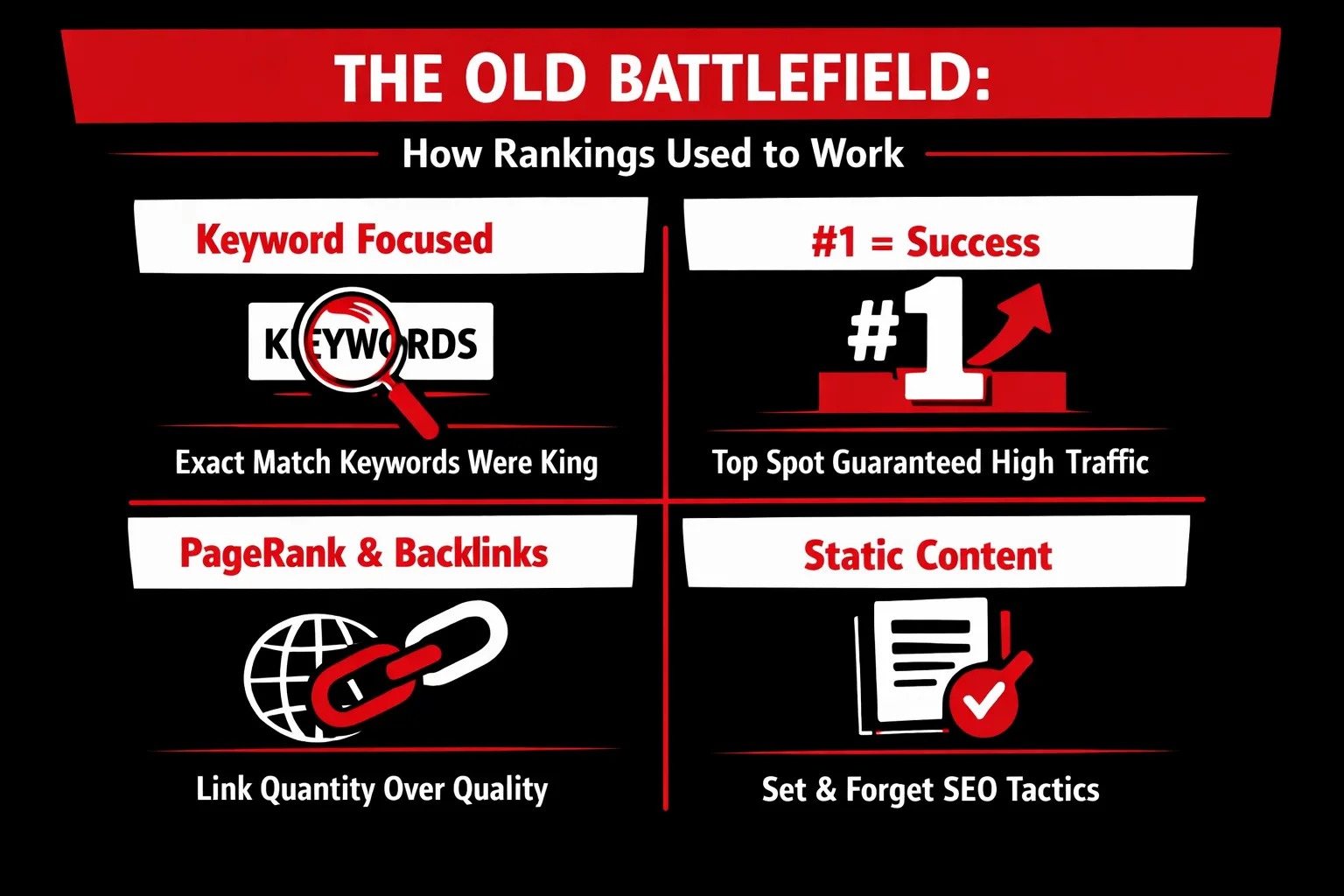 For a time, this approach worked. The web was smaller, user behavior was simpler, and Google needed mechanical signals to sort information at scale. But success was fragile—it depended on the battlefield never changing.