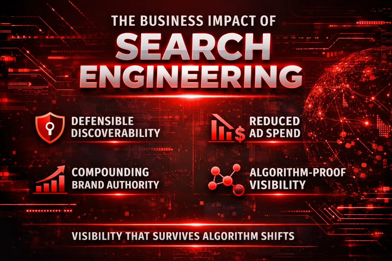 Search Engineering elevates search from a volatile marketing channel into a durable growth engine. It creates discoverability that competitors cannot easily displace, lowers dependency on paid media, compounds brand authority, and withstands algorithmic change.