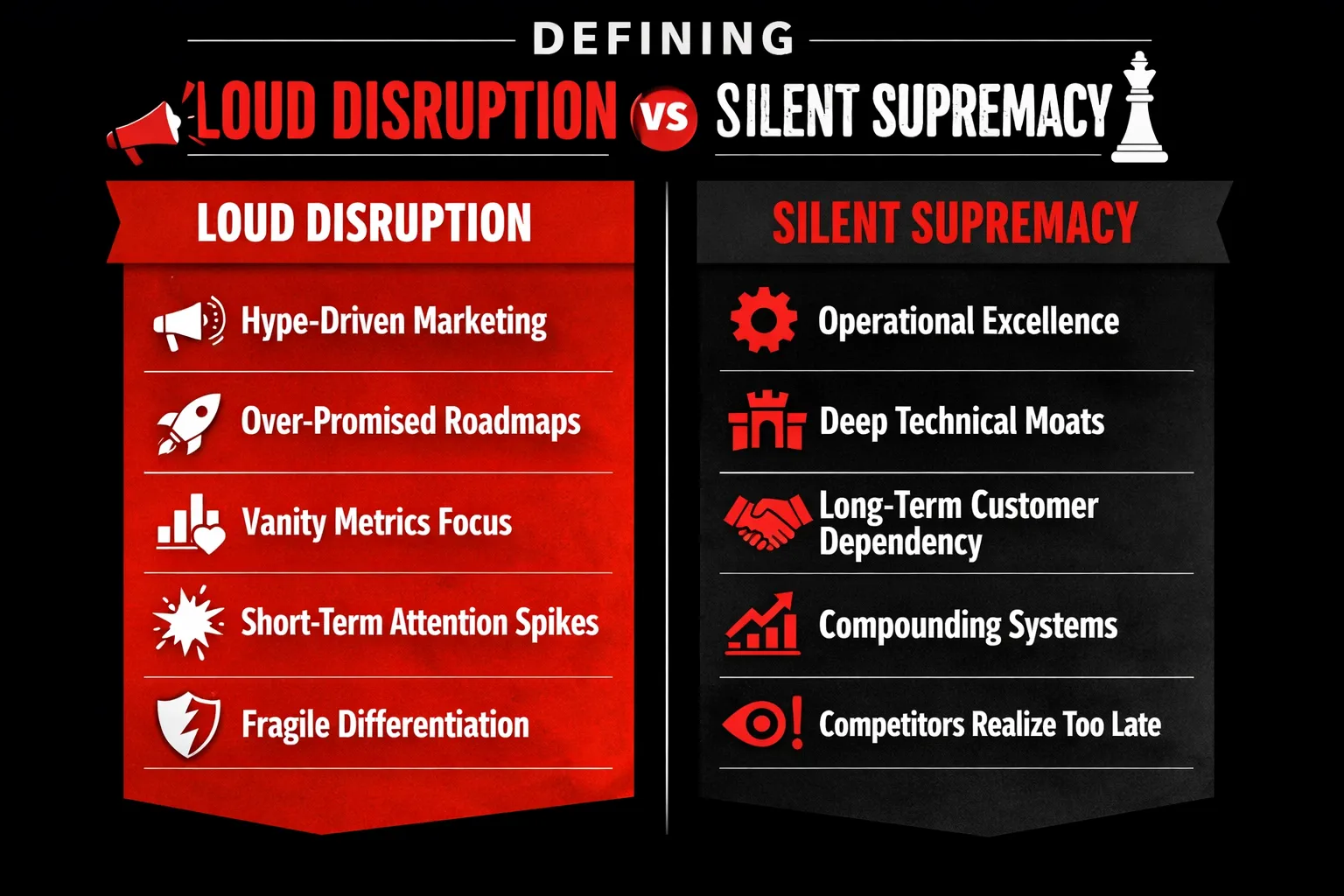 Loud disruption is visible early. It draws attention quickly, invites imitation, and sets off a race where everyone learns from your moves. Silent supremacy is different. It grows beneath the surface—quietly accumulating reliability, trust, distribution, and performance until switching away feels irrational. It doesn’t announce itself. It becomes irreversible.