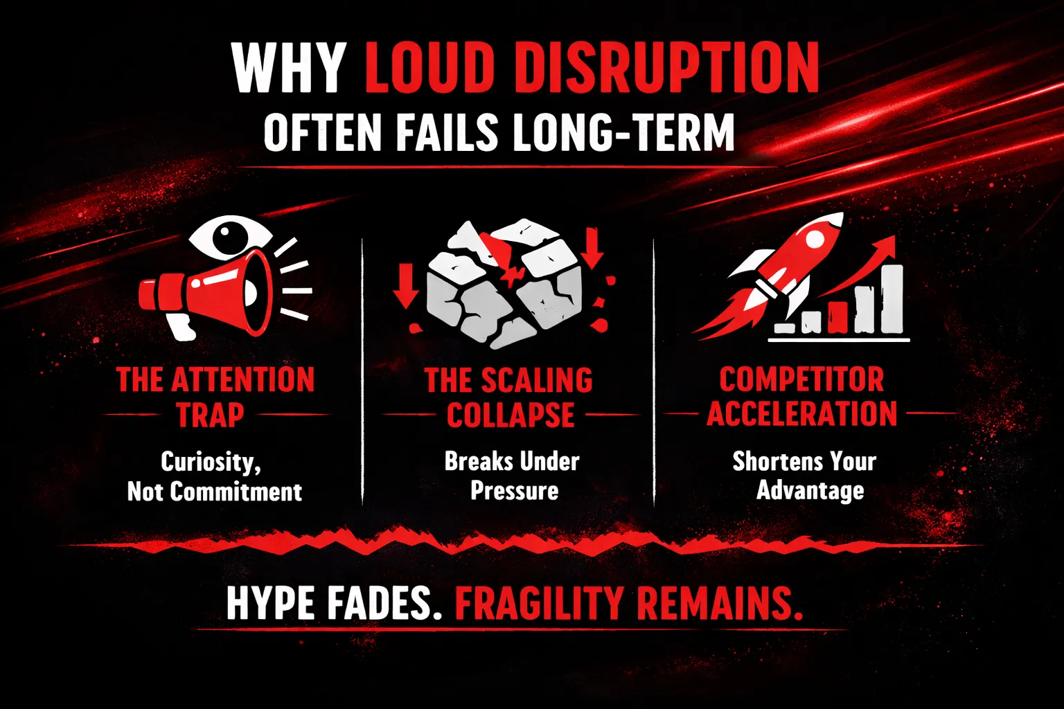 Loud disruption thrives on visibility. It is engineered to capture mindshare quickly, often at the expense of durability.