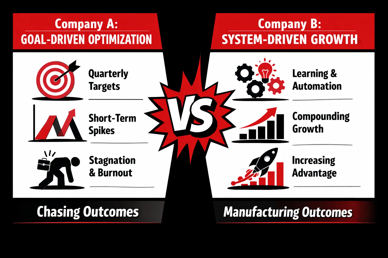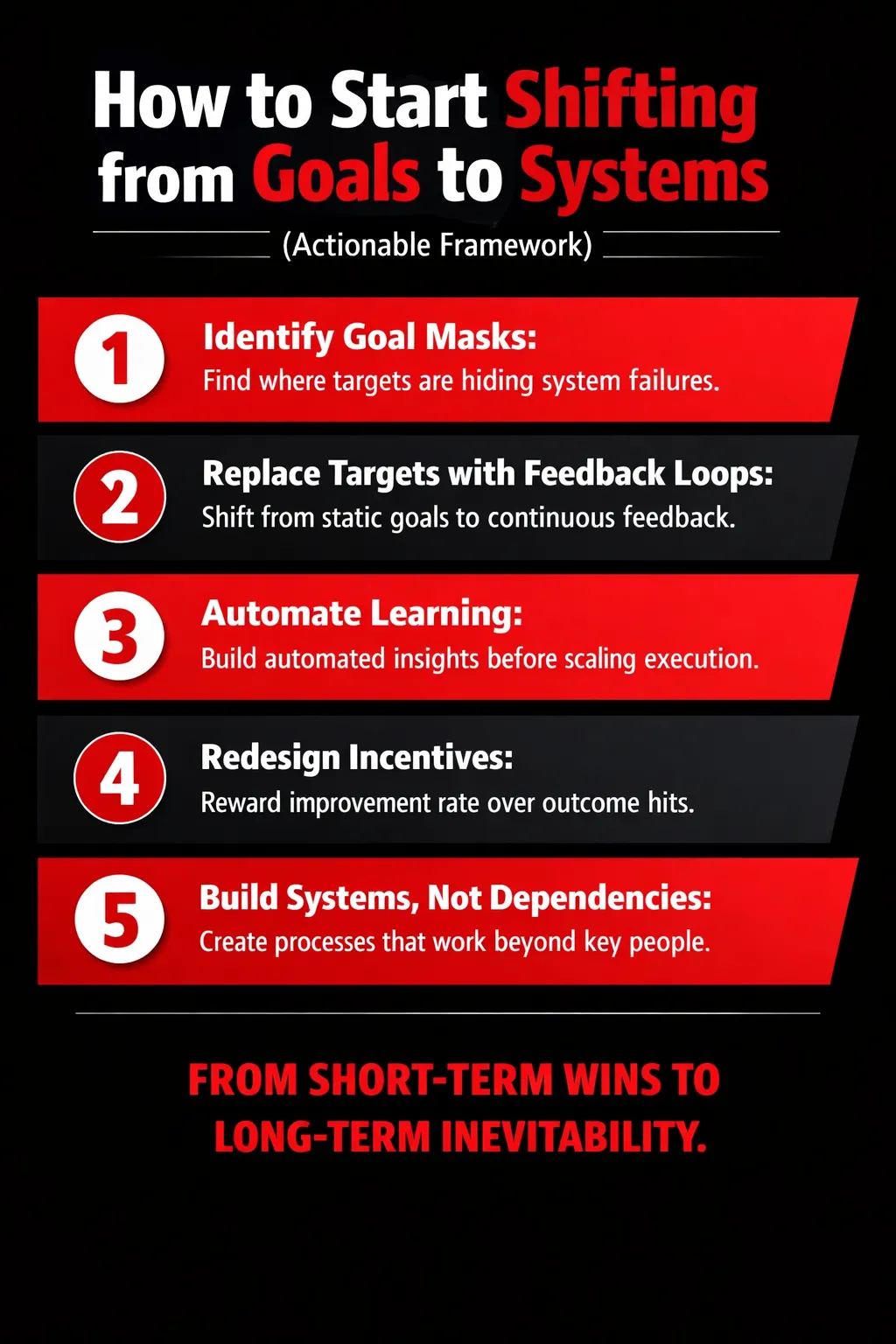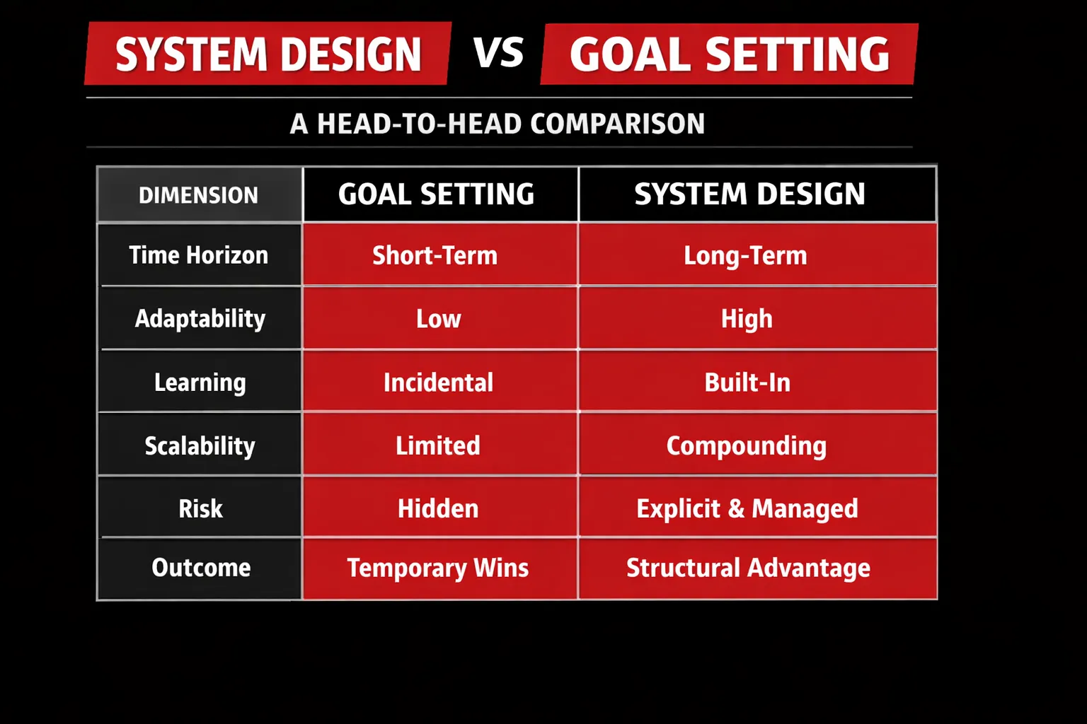 In the long run, this is why goal-centric organizations struggle to compound advantage. They optimize for today’s success, while systems-focused organizations quietly design tomorrow’s inevitability.