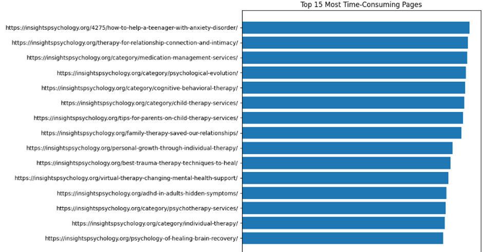 - Top 15 Most Time-Consuming Pages (Bar Chart) → Shows which URLs eat crawl time.