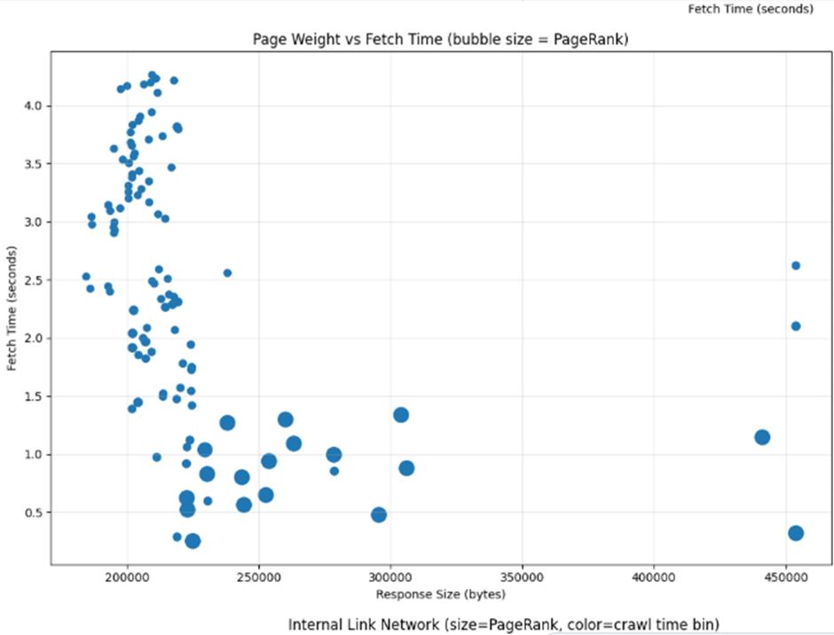 - Page Weight vs Fetch Time (Scatter Plot) → Spot heavy pages vs slow pages (bubble size = PageRank).