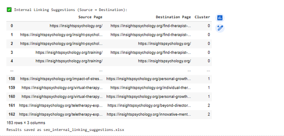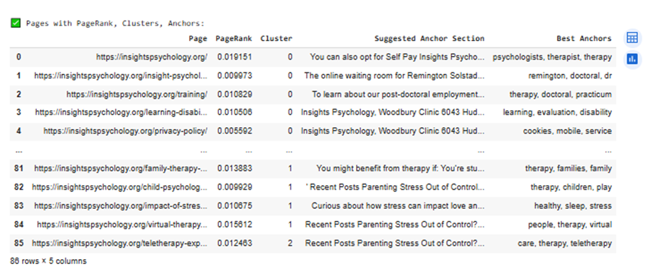 A specialized output module generates actionable linking suggestions. It identifies source pages that can pass authority and relevance to destination pages effectively. By combining PageRank scores with semantic similarity, the system produces a network of internal links designed to improve crawl efficiency, distribute authority evenly, and strengthen overall site structure.