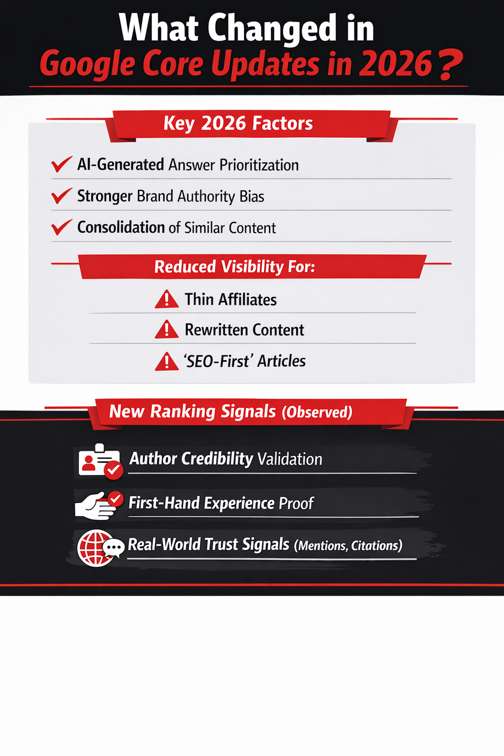 Google core updates in 2026 marked a clear shift in how search quality is evaluated and rewarded. While earlier updates focused heavily on content relevance and backlinks, the latest updates reflect Google’s aggressive push toward trust, experience, and brand-level authority, especially in an ecosystem now saturated with AI-generated content.