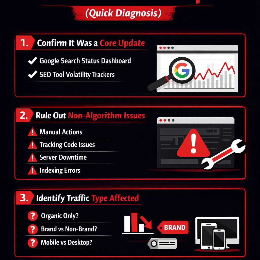 When traffic drops after a core update, most site owners jump straight to fixing things without fully understanding what actually went wrong. That usually leads to wasted effort. The smarter approach is to diagnose before you repair. Google does not randomly reduce visibility. It reassesses value. Your job is to figure out which part of that value equation changed.