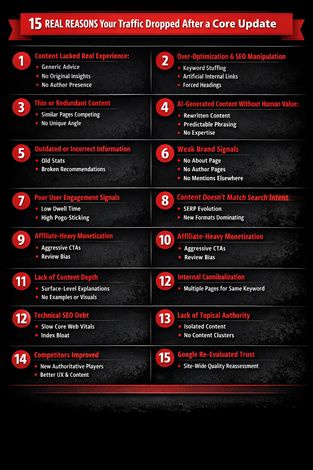 Below are the most common and proven reasons sites lose traffic after core updates, based on patterns seen across multiple industries.