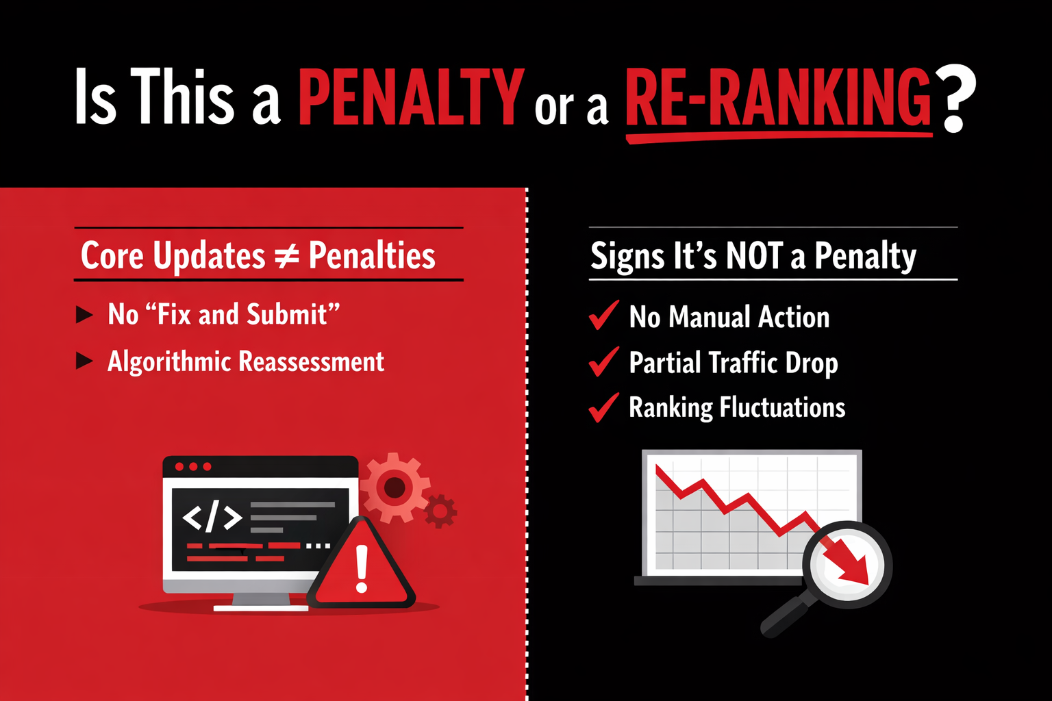 Penalties are corrective actions. They happen when a site violates specific guidelines, and they usually come with a clear signal such as a manual action notice in Google Search Console. Core updates work very differently. There is no form to submit, no reconsideration request, and no single issue to “fix and resend.” Google is simply re-evaluating content quality, relevance, and trust across the entire search ecosystem.