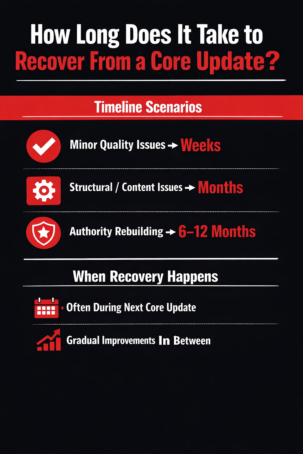 In many cases, noticeable recovery happens during the next core update. That is when Google fully reevaluates sites at scale. However, smaller gains often appear in between updates as content improves, engagement stabilizes, and rankings slowly return for long-tail queries.