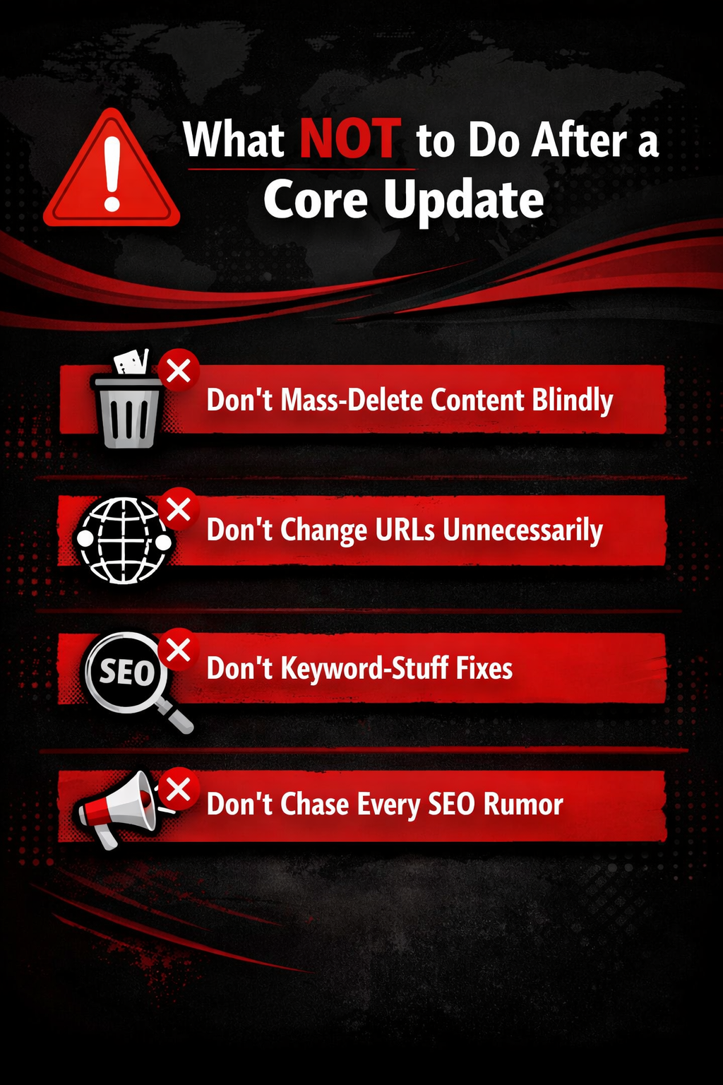 When traffic drops after a core update, panic is natural. The problem is that panic-driven decisions often do more damage than the update itself. Some of the most common reactions feel productive in the moment, but they quietly weaken your site over time.