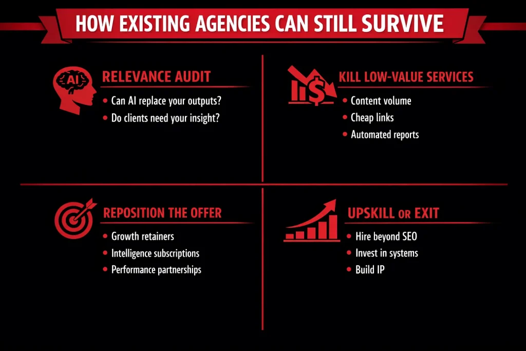 The extinction of traditional SEO agencies is not inevitable—but survival will require brutal honesty, decisive action, and a complete rethink of what “value” means in an AI-dominated search ecosystem. Agencies that make the transition won’t do so by adding new tools or rebranding old services. They’ll survive by eliminating irrelevance and rebuilding around intelligence, outcomes, and systems.