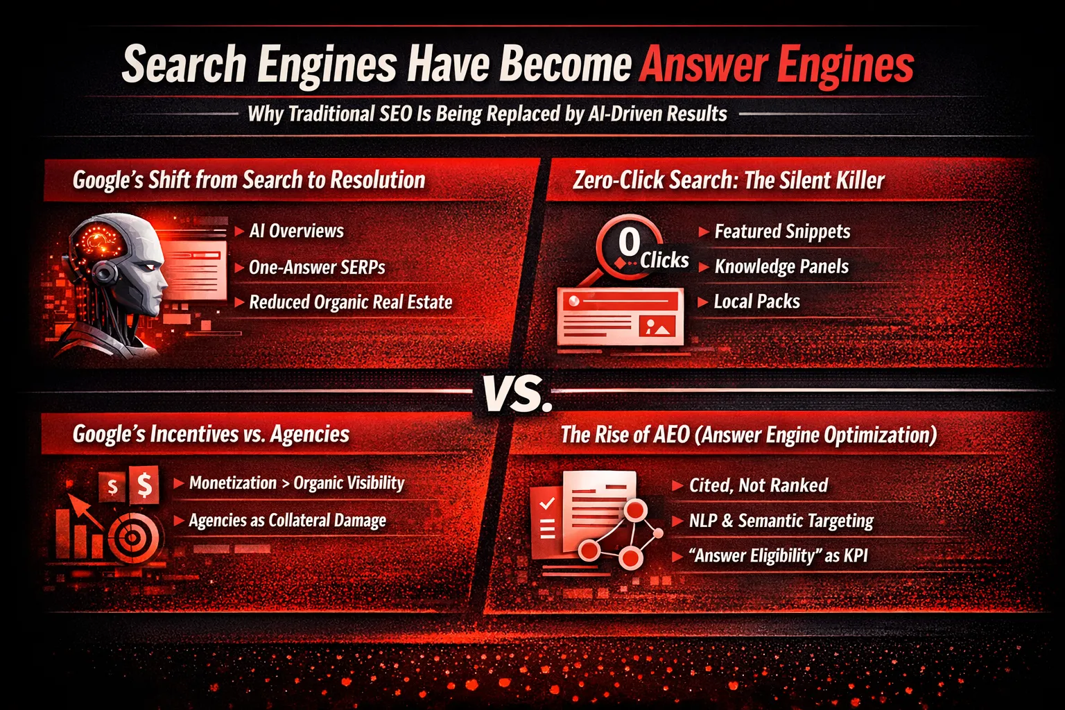 For more than two decades, search engines functioned as gateways. You typed a query, received a list of links, and chose where to go next. That era is ending. By 2026, search engines—especially Google—will no longer be judged by how well they direct traffic, but by how efficiently they resolve intent. This single shift is one of the biggest reasons traditional SEO agencies are rapidly losing relevance.