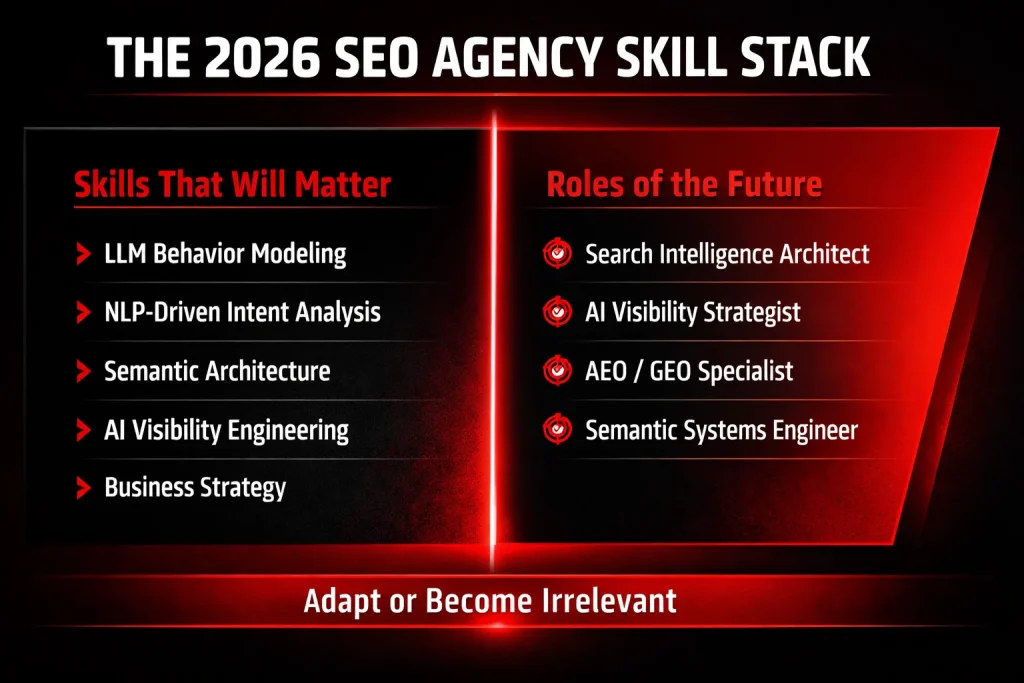 By 2026, the defining factor between surviving SEO agencies and those that fade into irrelevance will not be tools, tactics, or even AI adoption—it will be skills. The SEO agency of the future will look far less like a production shop and far more like a search intelligence firm. Execution will be automated. Insight, interpretation, and orchestration will be the real value.