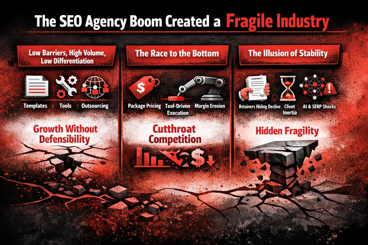 The SEO agency boom didn’t fail because of a lack of demand. It failed because it optimized for scale instead of substance—and fragility is the inevitable cost of that choice.