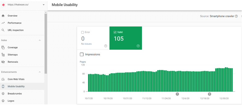 Remember we had 391 pages indexed but the screenshot above shows that there are only 105 valid mobile pages. Hence, we can conclude that there is an issue with mobile-first indexing.