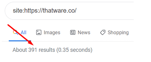 First of all, we need to check the index pages count for the website. The easiest way to do it is to use type Site:{your domain name} in the Google search bar. Google index value for thatware.co = 391 (Check the below screenshot for proof of statement)