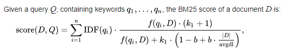 The name of the actual ranking function is BM25. It usually referred to as “Okapi BM25” (Online Keyword Access to Public Information). BM25 is a bag-of-words retrieval function that ranks a set of documents based on the query terms appearing in each document, regardless of their proximity within the document.