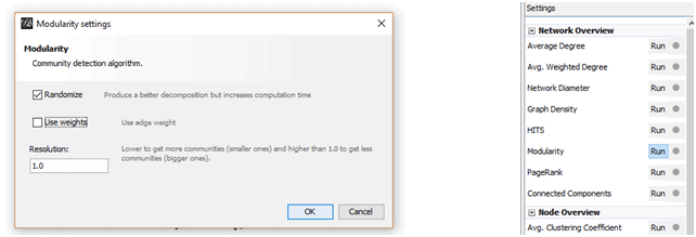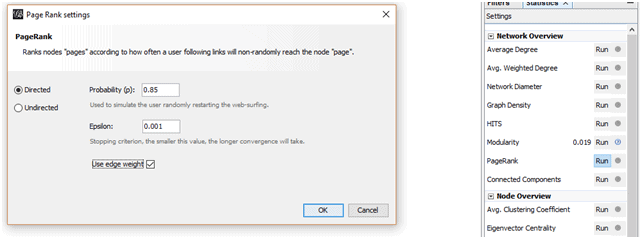 These options are available in the “Statistics” tab, and then we ran using the default settings for PageRank, but for Modularity we un-ticked “Use weights.” This will append data about your pages in new columns that will be used for the visualization and plotting later on.Ran Modularity-