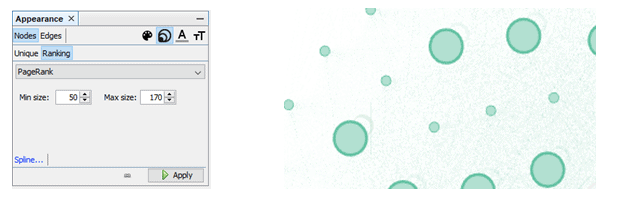 We choose nodes then its size, then the ranking tab, gave min size, gave max size.