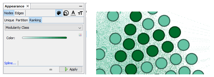 In here we choose nodes then Color, then the ranking tab, then choose Modularity class.