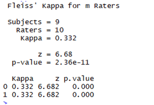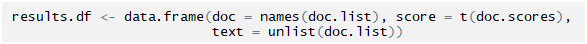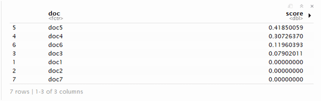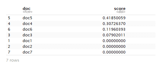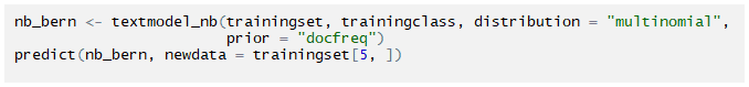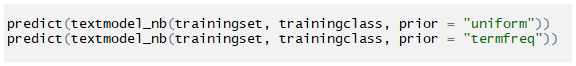 prior distribution on texts; one of “uniform”, “docfreq”, or”termfreq”. Prior distributions refer to the prior probabilities assigned to the training classes, and the choice of prior distribution affects the calculation of the fitted probabilities. The default is uniform priors, which sets the unconditional probability of observing the one class be the same as observing any other class. Getting the result: